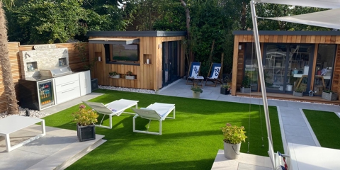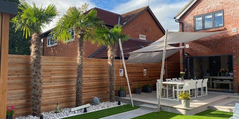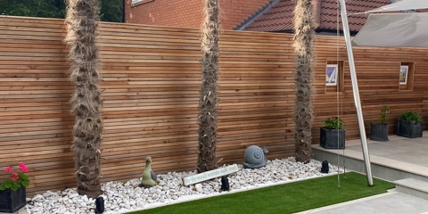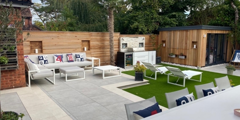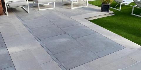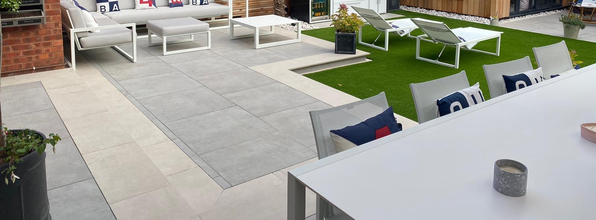 Our SYMPHONY Urban range in Ash has been used to bring this space to life. The large format size adds a modern finish, while the soft grey tones work perfectly with the cedar fencing and green lawn, creating a perfect balance of colour and texture. The choice of porcelain is also an ideal choice for a busy garden too, as it's low maintenance, easy to clean, and built to last!