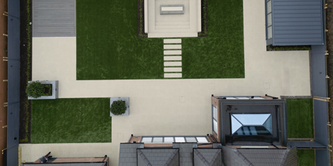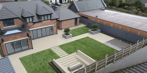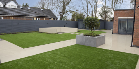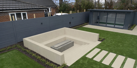 The Off White colour works perfectly against the grass, creating a striking contrast between the soft and hard landscaping. The built-in seating also keeps the space effortlessly tidy and easy to maintain, whilst also been a great focal point within the garden.