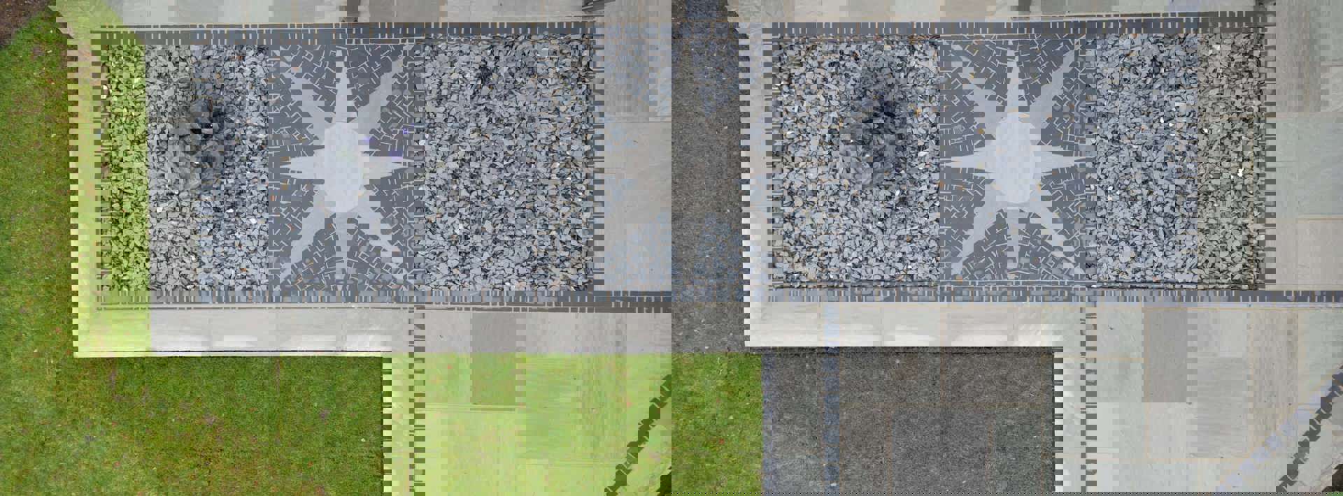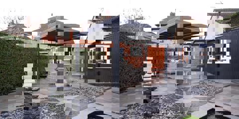 A standout star-design feature adds a bespoke touch, complemented by sleek edging, slate detailing, and a modern pergola that transforms the patio into a versatile year-round entertaining area.