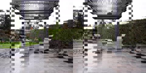 This striking outdoor space showcases the natural charm of Indian Sandstone paving, with its warm tonal variations and handcrafted finish creating an inviting foundation for stylish garden living.