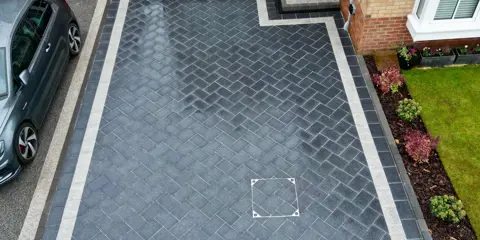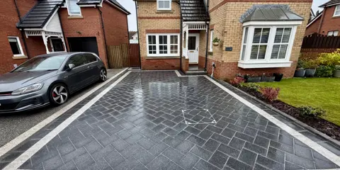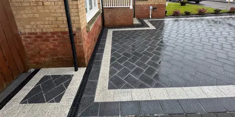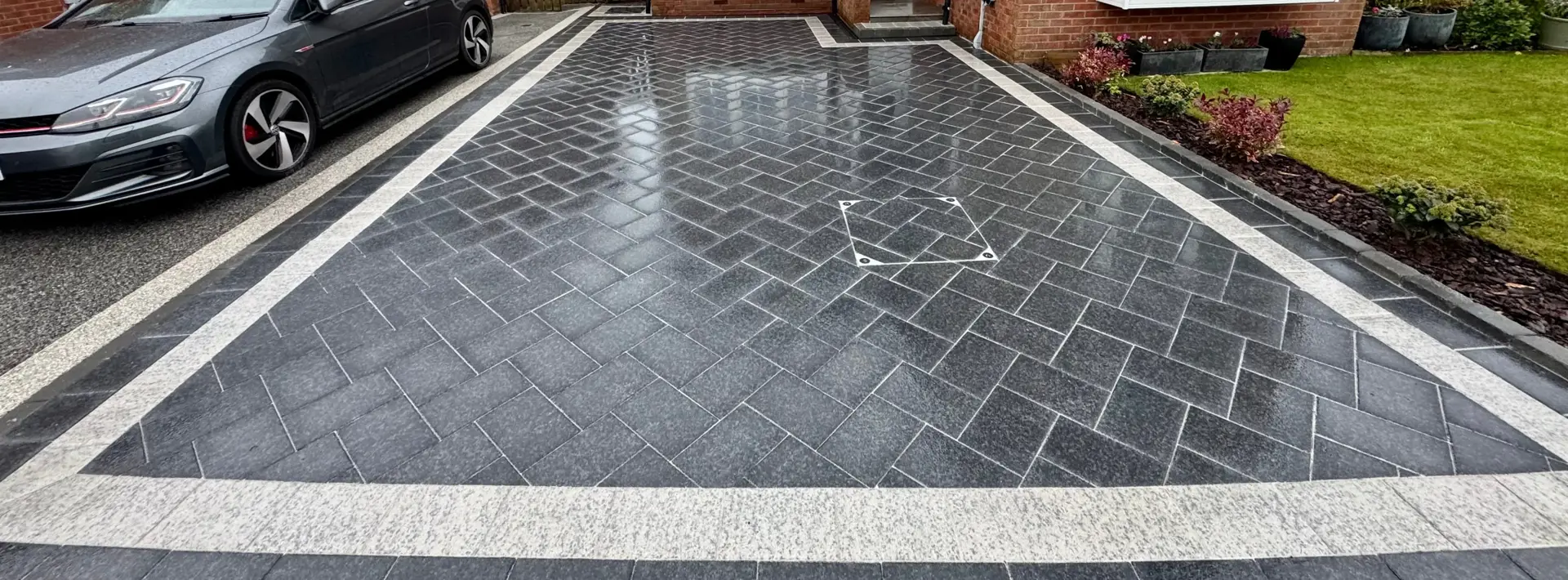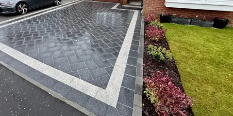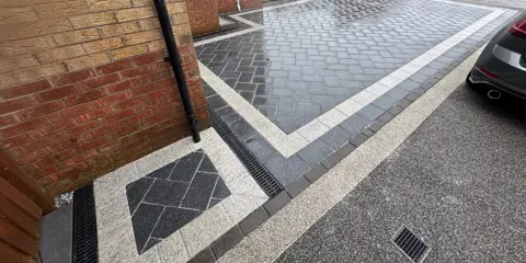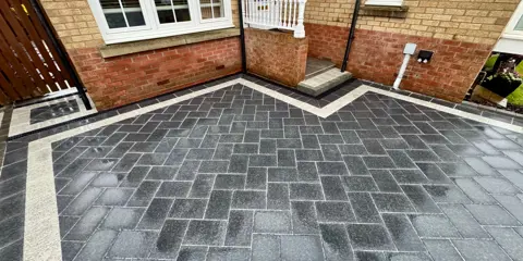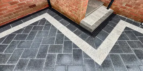 Laid in a herringbone pattern, the Shadow colourway forms the main driveway, bringing depth, texture and visual interest, while the contrasting Ice border creates a striking frame that defines the space and elevates the overall design.