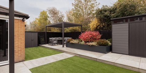 The patio has been transformed using our SYMPHONY® Lapis porcelain paving which mimics terrazzo natural stone, and SYMPHONY® Planks that look like stylish wooden decking… both without the upkeep! This combination of stone and wood finishes really adds character to the space, and works perfectly together!